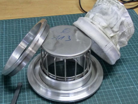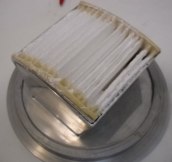 pleated media pack - flattened and clamped in standard holder | mini-bag with special cage after testing | pleated media pack in special holder |